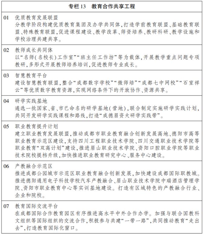 在推动教育同城化发展方面,《规划》提出将统筹教育资源跨市配置,构建学前教育和特殊教育发展联盟,优化成德眉资4市中小学布局,鼓励成都优质中小学校与德眉资合作办学,推动中小学劳动教育试验区改革发展。将组建区域型、行业型及复合型职业教育集团,促进产业链、岗位链、教学链深度融合。推动大学大院大所全面合作, 深化校长和教师跟岗研修常态化工作机制,联合打造教师成长共同体。