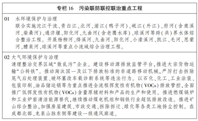 加强大气污染联防联控。《规划》提出将联合实施成都都市圈大气污染联防联控工程。将建设通风廊道,建设重污染天气应急动态决策管理系统,开展交界地带重污染天气预警统一分级标准试点,建设细颗粒物与臭氧协同控制监测网络,推动大气污染跨界治理。