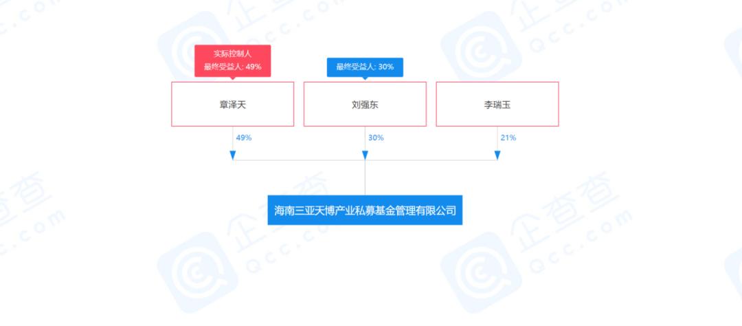 天眼查显示,海南三亚天博产业私募基金管理有限公司近日成立,注册资本1000万人民币,法定代表人杨世毅。经营范围含一般项目私募股权投资基金管理、创业投资基金管理服务。股权穿透图显示,海南三亚天博产业私募基金管理有限公司是由刘强东、章泽天、李瑞玉共同持股。消息一出,引来业内强烈关注。