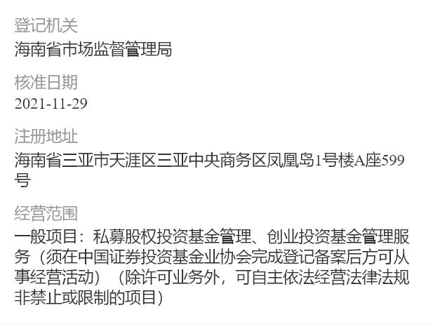 据天眼查显示,11月29日,海南三亚天博产业私募基金管理有限公司成立,注册资本1000万人民币,法定代表人为杨世毅。