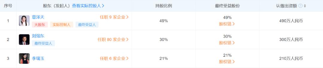 股权穿透图显示,该公司由章泽天、刘强东、李瑞玉共同持股。刘强东出资300万人民币,持股比例为30%;章泽天出资490万人民币,持股比例为49%;李瑞玉出资210万人民币,持股比例为21%。
