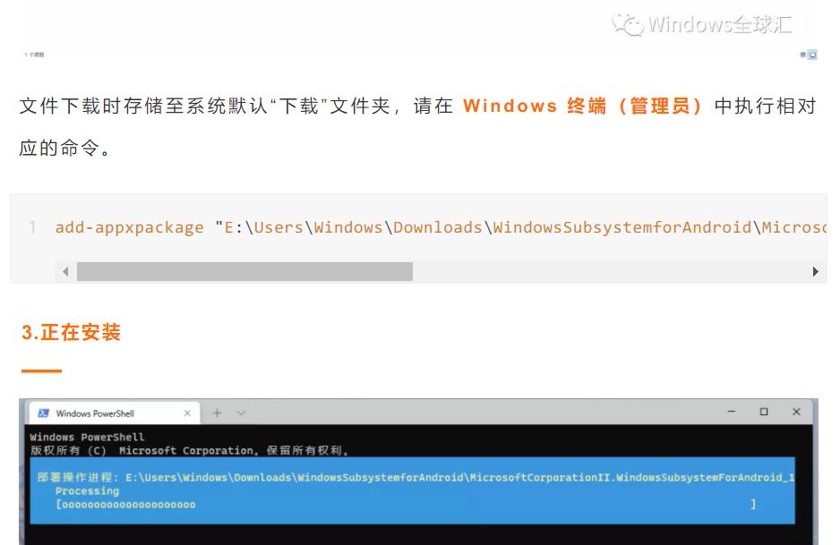 好在 WSA 支持侧载,也就是可以直接安装 APK 包,我们也只能用这个方式。但过程相当复杂,需要使用多个命令行条目。