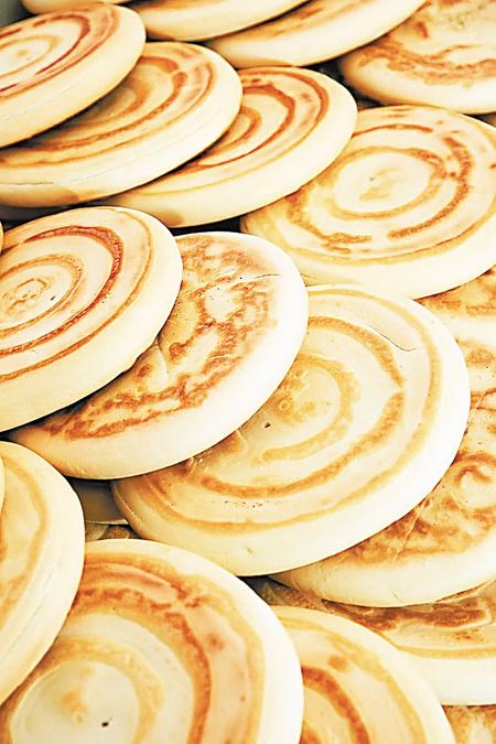 烙馍之所以好看,也是因为“馍法师们”可以用任何东西做出面饼花纹——瓶盖、罐盖,(洗干净的)梳子、没用过的牙签等;烙馍之所以好吃,是因为许多东西可以拌进馅料——除了姜黄、红曲、苦豆子以外,还有核桃、杏仁、捣碎的花椒叶,各种香味总能与麦香凑在一块,暄腾起来。