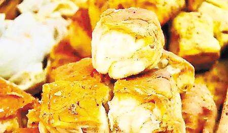 刚出炉的千层烤馍冒着热气,表面饼皮酥脆,内里见大千世界——花生、核桃、瓜子仁、芝麻、葡萄干,每一层都充满惊喜;再夹杂油酥,以及香甜的玫瑰酱和枣泥,就算咬一大口也吃不掉所有东西,它那扎实丰富的口感,真要细细咂摸才行。