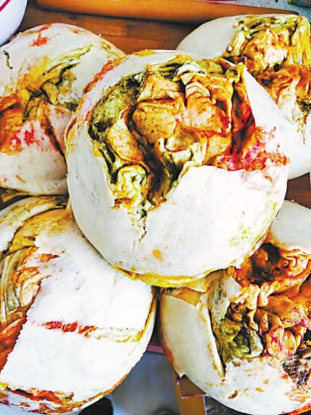 除了静宁锅盔,甘肃其他地方的锅盔也各具特色。天水张家川锅盔,有干面锅盔和鸡蛋锅盔两种,以“厚”和“大”闻名;玉门花锅盔,面饼图案为“嫦娥奔月”“松竹梅兰”和“仙桃果”之类;陇南哈达铺的红军锅盔,是当地人当年献给长征红军的最高礼品,后来锅盔的外观被改成八个瓣组成,象征着红军的八角帽。