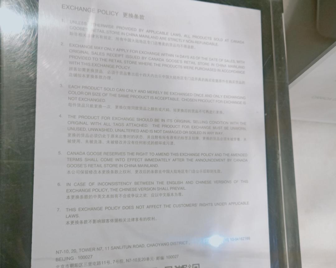 但有法律人士称,加拿大鹅门店店员在上述消费者付款后要求签署的《更换条款》,就是一种格式条款,属于无效内容,违反了中国《消费者权益保护法》。