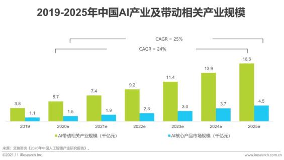 随着数字产业化和产业数字化的不断深化,我国数字经济高速发展,在宏观经济中的重要性持续提升。2020年中国人工智能核心产业规模超过1500亿元,至2025年预计超过4500亿元,2020-2025年人工智能核心产品CAGR为25%;2020年人工智能带动相关产业规模超5700亿元,至2025年将突破16000亿元,2020-2025年人工智能带动相关产业CAGR为24%。在新产业、新业态、新商业模式经济建设的大背景下,人工智能产业的成长速度令人瞩目,并已逐步展现出从单向的产品供应向各产业深度双向共建的发展特征,带动相关产业发展,回馈社会经济。在这样的发展环境下,企业对人工智能的需求逐渐升温,人工智能在企业端的应用成熟度也渐入佳境。