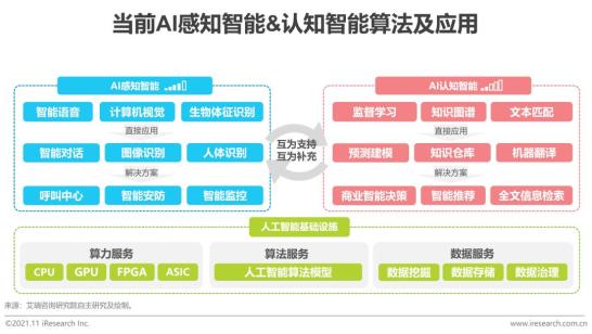 一般认为,人工智能可分为感知智能和认知智能两大类。感知智能以智能语音、计算机视觉和部分生物体征识别(如体态识别)为核心底层技术,对应的上层应用为智能对话、图像识别和人体识别等,分别直接应用于客服机器人、智能安防、智能监控等解决方案;认知智能以机器学习/深度学习、知识图谱和自然语言处理等为核心底层技术,对应的上层应用为预测建模、知识仓库、机器翻译等,分别直接应用于商业决策、智能推荐、全文信息检索等解决方案,二者是互为支持和补充的关系,同一个AI解决方案中往往包含多种技术。目前我国感知智能的算法研发和应用落地相对成熟,而认知智能正在加速发展过程中,未来将有着更广阔的应用空间。