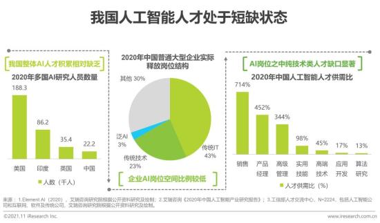 作为前沿IT技术的代表,人工智能产业近年来高速发展,带动了市场对AI人才的集中需求。与许多发达国家相比,我国的AI人才总数仍处于短缺状态,而在企业微观层面上,AI人才市场表现出人才相对集中于互联网科技公司,且技术人才缺口更加显著等问题。人才短缺导致企业的AI需求无法得到及时满足,而人才的培养也非一日之功,长期来看这依赖于IT教育的转型和结构调整,而在短期则更需要产业端通过复用成熟能力、降低应用难度、促进技术交流等方式来提升业内人员的产出能力。