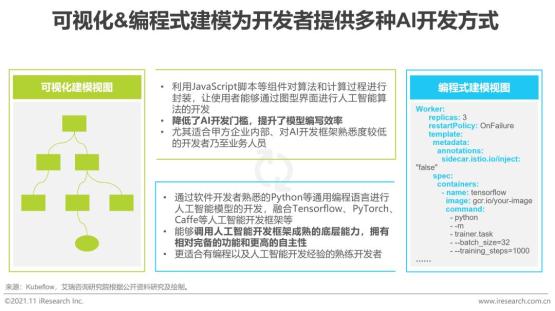 云原生AI开发平台配备多种人工智能模型开发模式,其中较为典型的是可视化建模和编程式建模。前者利用JavaScript脚本等组件对算法进行封装,使得用户能够通过拖拽等图型界面进行模型开发,帮助对编程语言不熟悉的甲方企业的开发者乃至业务部门进行定制化开发;另一方面,编程式建模一般基于TensorFlow、PyTorch、Caffe等AI开发框架,利用Python等通用编程语言进行模型开发,由于上述开源框架普遍具备完备的功能,能够赋予开发者更多的开发选项和进行编程优化的空间。云原生组件如容器和微服务框架也能够从底层架构方面对编程、测试等过程进行支持,进一步提升开发者的开发效率。