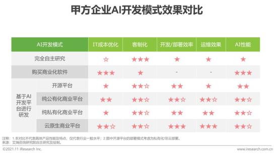 产品&关键技术:云原生AI开发平台融合了成熟的人工智能开发框架以及云原生工具灵活调用云资源、高效部署云应用的能力,一方面帮助企业开发者提高算法模型的开发效率,另一方面提升交付、部署、运维环节的效率并降低TCO。横向对比甲方企业可能采用的诸多获取人工智能能力的平台和方式之后,我们认为云原生AI开发平台在AI开发应用全生命周期视角下具备一定的综合优势。
