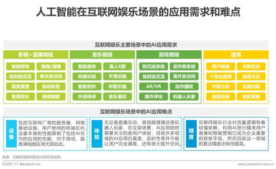 互联网娱乐行业的成长植根于各类前沿IT技术,其产品服务和商业模式的演进与IT技术的发展紧密相关。近年来随着人工智能技术的进步,互联网娱乐产品的形式和内容也在不断迎来创新,互联网企业运用各类智能组件为用户带来了更强的沉浸感、交互感和趣味性,同时也利用用户画像和智能营销系统充实客户群体、提高用户粘性。总的来说,人工智能在互联网娱乐领域的应用非常广泛,同时,互娱企业在应用人工智能的同时也面临着设备、用户体验、推荐模型精度等方面的不足,仍有较大的改进空间。