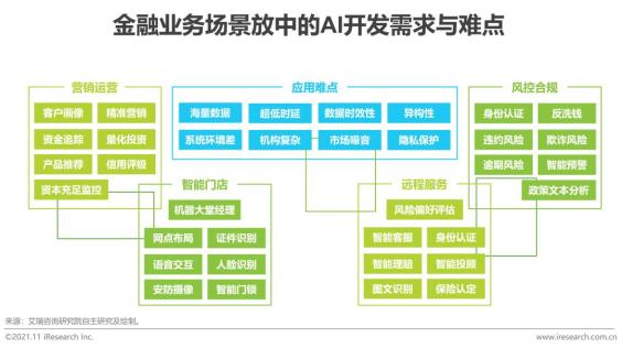 金融行业的运行无处不与数字打交道,这一特性决定了金融业务与大数据和人工智能应用有着天然的契合性,加之金融机构普遍资金充足、信息化水平相对较高,因此对人工智能的投入度较高,与IT企业的合作开发也较多。具体来看,人工智能在金融机构的营销决策、智能门店建设、在线服务、风控合规等领域都有较多的应用,与低代码、RPA等效率工具配合,能够替代金融机构员工完成大量重复性高且复杂的工作,提升机构运营的效率,并避免人工操作带来的疏漏。另一方面,金融机构客户群体较大,需要实时处理海量数据,且金融服务对交易数据实时性和同步要求超过其他任何行业,更需要人工智能在满足客户和机构需求的同时不能够对系统性能造成显著影响。
