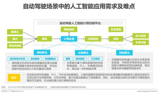 在智能化、网联化、电动化、共享化的背景下,自动驾驶成为智能网联汽车行业发展的重点,也成为了下一代汽车企业转型升级的技术高地。自动驾驶对算力、实时性、安全性等系统性能的要求极高,且自动驾驶的工作环境复杂多变又涉及公共交通安全,要求计算机在极短时间做出正确的判断,因此需要以强大的算力、算法和数据传输能力作为支撑。在自动驾驶实现过程中,人工智能算法承接传感器接收的实时信息并进行数字化处理和分析,经过决策算法对周围环境进行的判断和预测,并对驾驶操作进行调整。