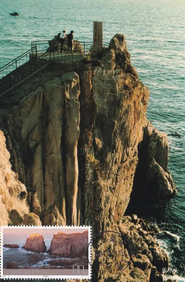 凭栏远眺,波澜壮阔,海天一色。这张明信片上的成山头石刻为“天无尽头”。