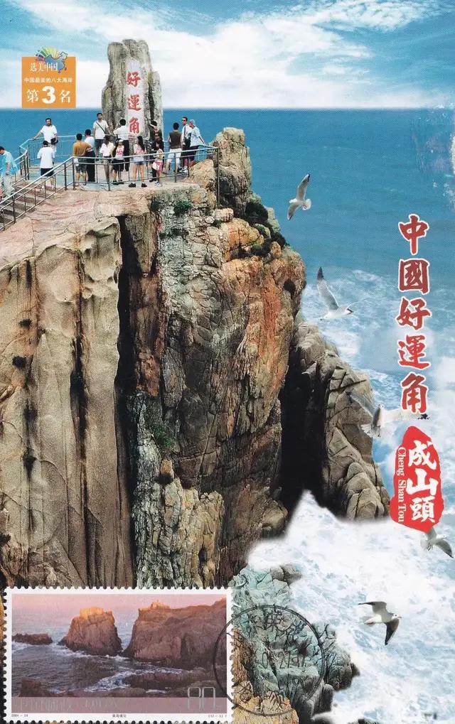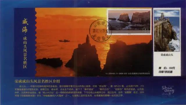 成山头——中国大陆伸向海洋的东极地,是中国最早看见日出的海上高角。这张明信片上介绍了成山头的历史。