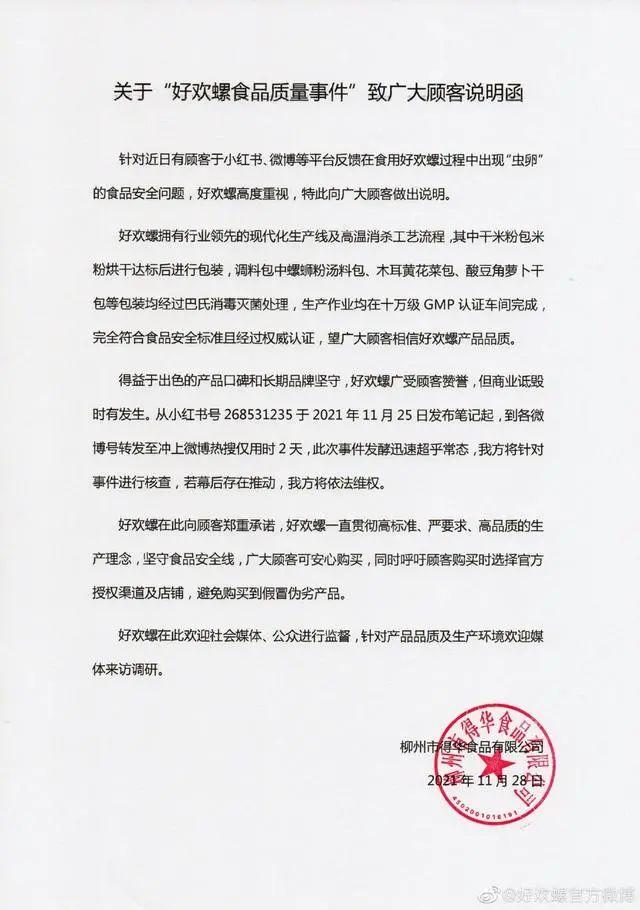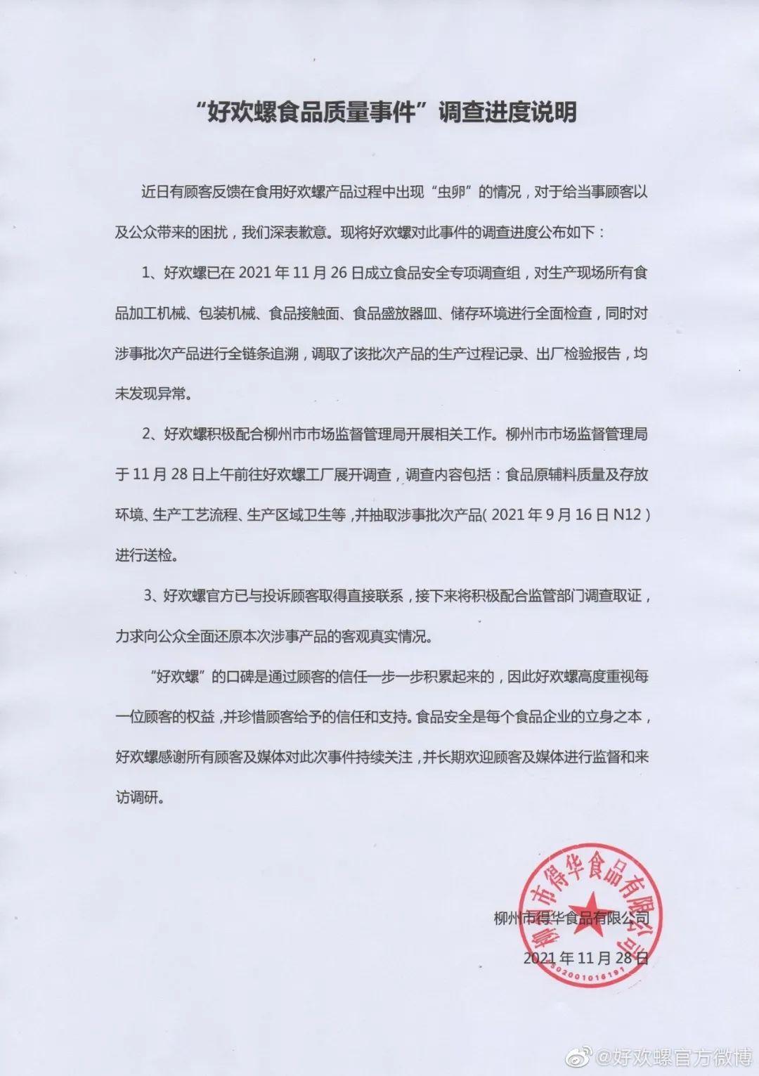 继上一封说明函在网络引发网友质疑后,好欢螺官方微博又于11月28日22点左右发布了《好欢螺食品质量事件调查进度说明》,其在说明中首次“深表歉意”并称已成立食品安全专项调查组,同时配合监管部门展开调查,且当地监管部门也已前往好欢螺工厂展开调查。另外,好欢螺表示已与投诉顾客取得联系,配合调查取证,力求向公众全面还原本次涉事产品的客观真实情况。