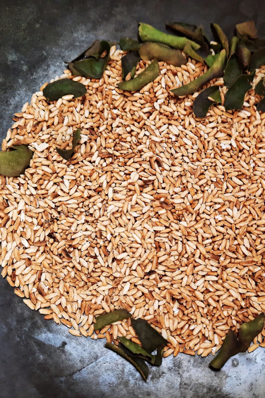 想要做好粉蒸,米粉是重中之重。大米加入八角、桂皮,小火干炒直到米粒微黄,此时便可以将一锅炒米细细打磨,成为制作粉蒸的米粉。