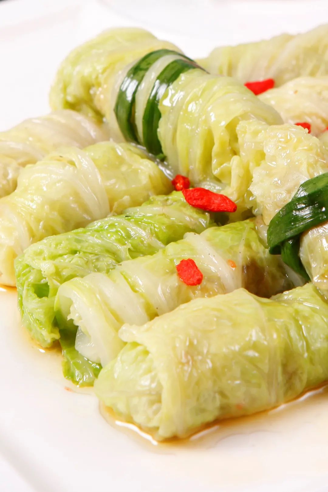 江浙地区有一道经典淮扬菜,翡翠白玉卷,用白菜作衣,将肉馅、玉米、木耳包裹其中,盛入小蒸笼慢慢蒸熟,玲珑小巧的外表充满了江南意趣,入口清鲜爽滑,嫩而多汁。