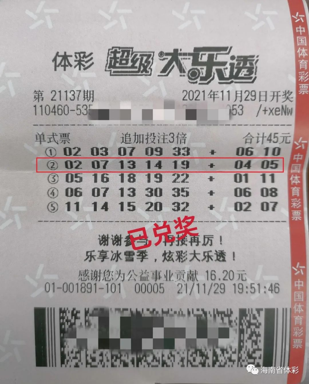 据“海南省体彩”官方微信,11月29日晚,体彩大乐透第21137期开奖号码为 “02、07、13、14、19+04、05”。中得该期3注追加一等奖的中奖人王先生(化名)已于11月30日上午火速现身海南省体彩中心兑奖。因他采用追加倍投方式投注,单票奖金高达4834万多元。领奖时,王先生大方地分享了他的购彩经历和心得,并慷慨解囊,主动捐出30万元给希望工程,用于资助海南省困难家庭学子上学。