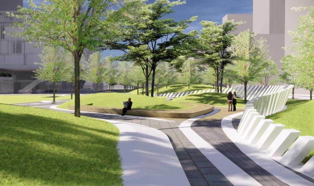 项目规划的核心绿轴带——云谷公园,打造景观绿化广场和水景,将与设计殿堂、大师工作室等重要设计文化建筑融为一体,满足商务休闲需求。