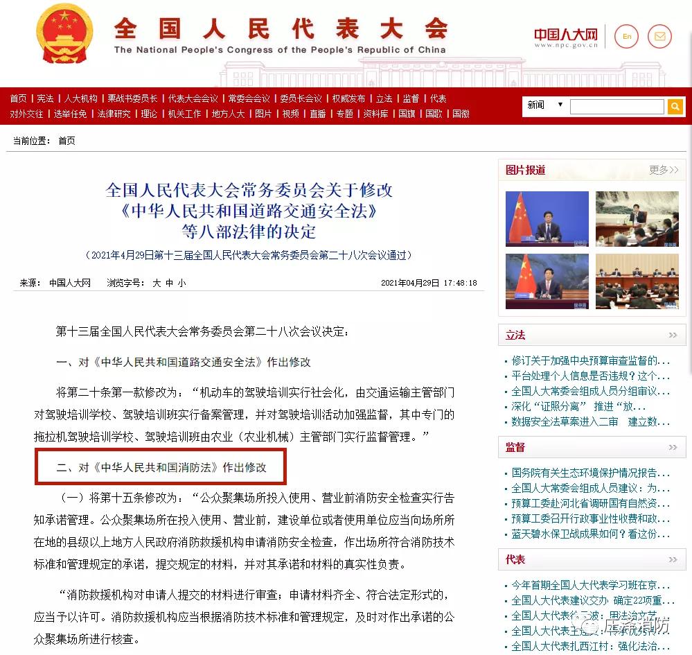 第十三届全国人民代表大会常务委员会第二十八次会议审议通过了修改《中华人民共和国消防法》(以下简称《消防法》)的决定,并自公布之日起施行。