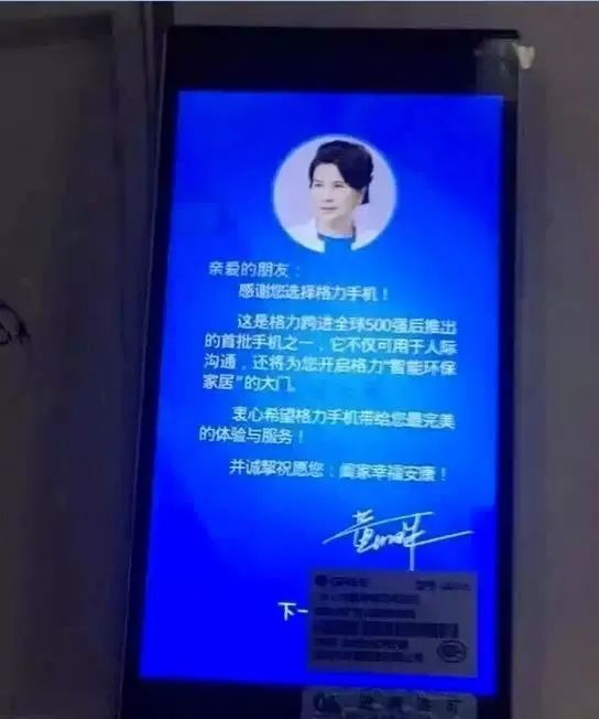 她甚至将自己的照片作为格力第一款手机的开机画面,照片上还有自己的签名和寄语。