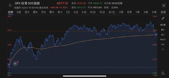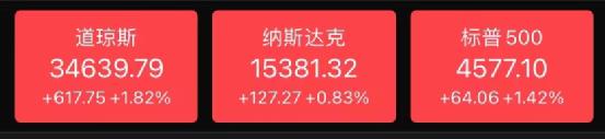道指收涨617.75点,涨幅1.82%,报34639.79,创近13个月最大涨幅;纳指收涨127.27点,涨幅0.83%,报15381.32点;标普500指数收涨64.06点,涨幅1.42%,报4577.10点,创10月14日以来最大单日涨幅。