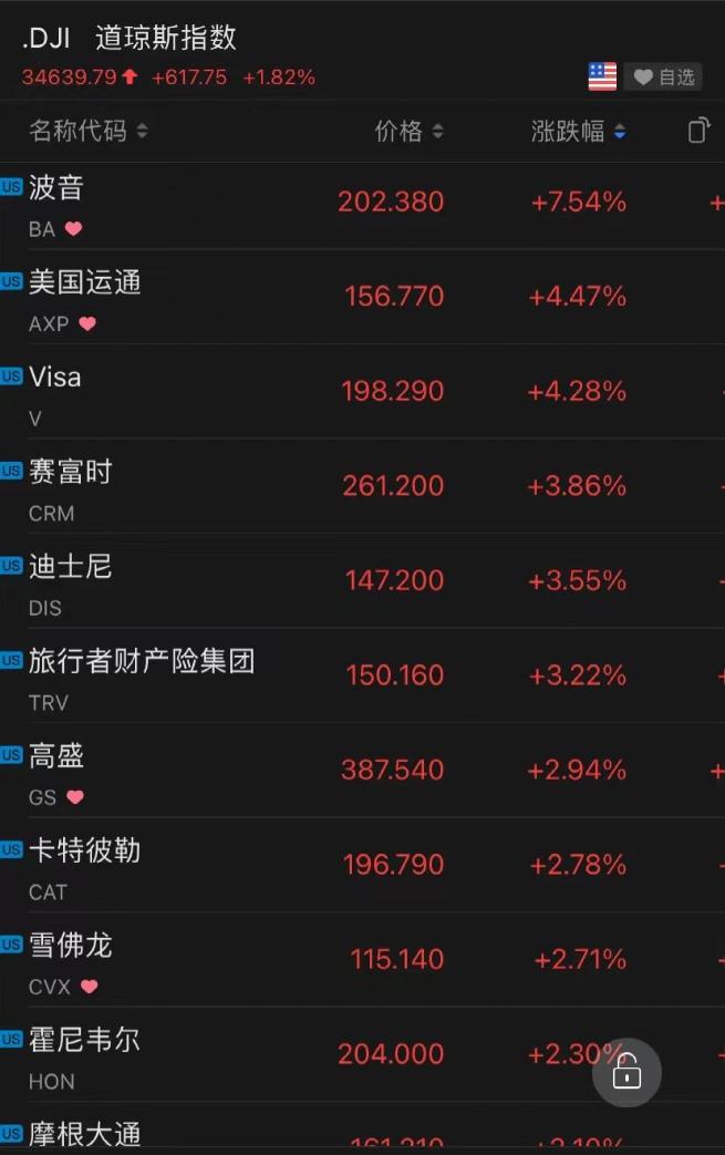 道指成分股成分股波音涨7.54%,巴菲特重仓美国运通涨超4%,领涨道指;但苹果跌0.61%,微软跌0.18%,沃尔玛跌1.22%。