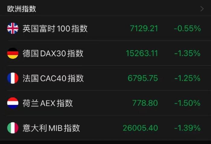 英国富时100指数跌0.55%,德国DAX30指数跌1.35%,法国CAC40指数跌1.25%,荷兰AEX指数跌1.5%,意大利MIB指数跌1.39%。
