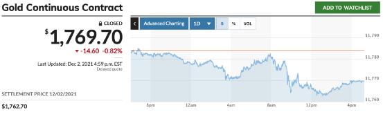 COMEX 黄金期货收跌0.82%,报1769.7美元/盎司。