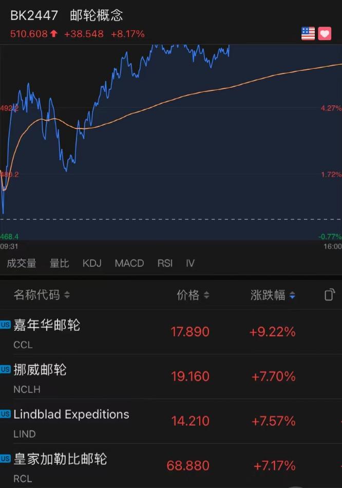 邮轮股方面表现亮眼,嘉年华邮轮涨9.22%,挪威邮轮涨7.7%,皇家加勒比邮轮涨7.17%。