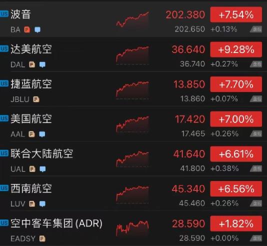 航空概念股表现强劲,截至收盘,波音涨7.54%,空客ADR涨1.82%,美国航空涨7%,美国联合航空涨6.61%,西南航空涨6.56%、捷蓝航空涨7.7%,达美航空跌涨9.28%。