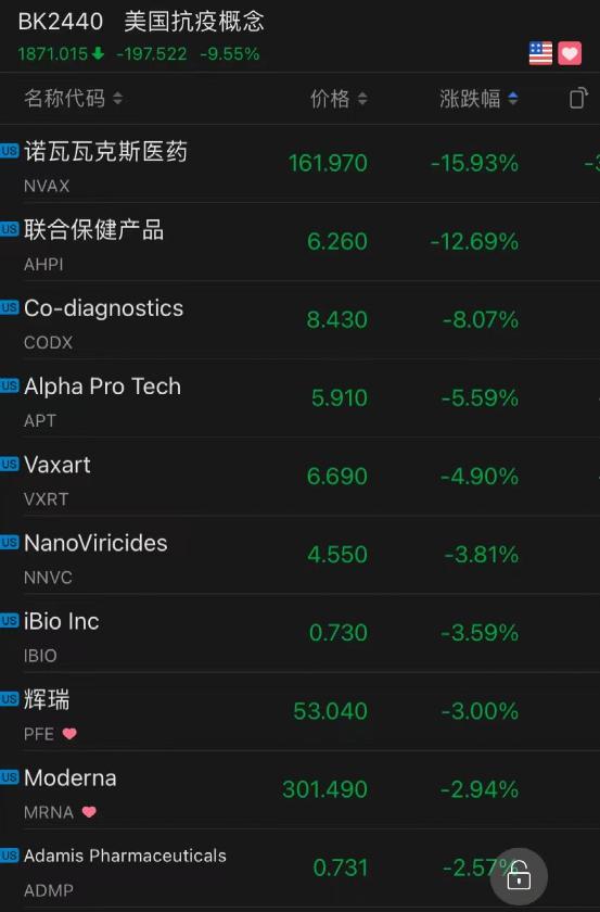 新冠肺炎疫苗/抗病毒药品概念股普跌。诺瓦瓦克斯跌近16%,辉瑞和莫德纳跌约3%,Alpha Pro Tech Ltd.跌5.95%。