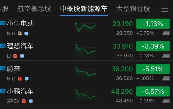 中概股新能源车方面,截至收盘,蔚来跌超5.51%,小鹏汽车跌5.57%,理想汽车跌超3.39%,小牛电动跌1.13%。但盘后都有小幅上涨。