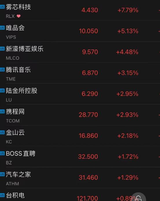 唯品会涨超5%,腾讯音乐涨3%,携程涨近3%,金山云涨超2%,Boss直聘涨1.72%。