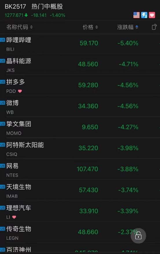 哔哩哔哩跌5.4%,拼多多、微博跌4.56%,网易跌3.88%,富途证券跌6%。