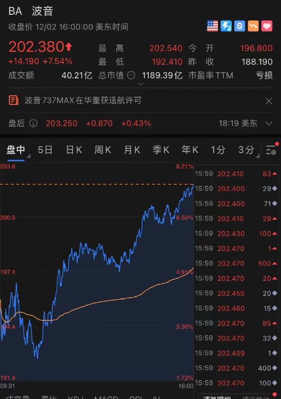 波音盘前一度涨超4%,收盘报202.38,涨幅7.54%,市值1189.39亿美元。