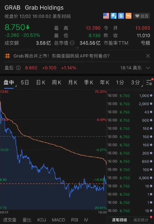 Grab上市当日震荡激烈。开盘报13.06美元盘中,高点一度达到13.29美元,涨幅20%。不过此后Grab盘中“破发”,且大体呈一路下行态势。全日最低8.13美元,意味着破发约26%,这一最低点也比IPO当日的日内高点13.29美元跌去近40%。Grab最终收盘大跌近21%,收于8.75美元。以IPO发行价计算,Grab上市后估值达到396亿美元。