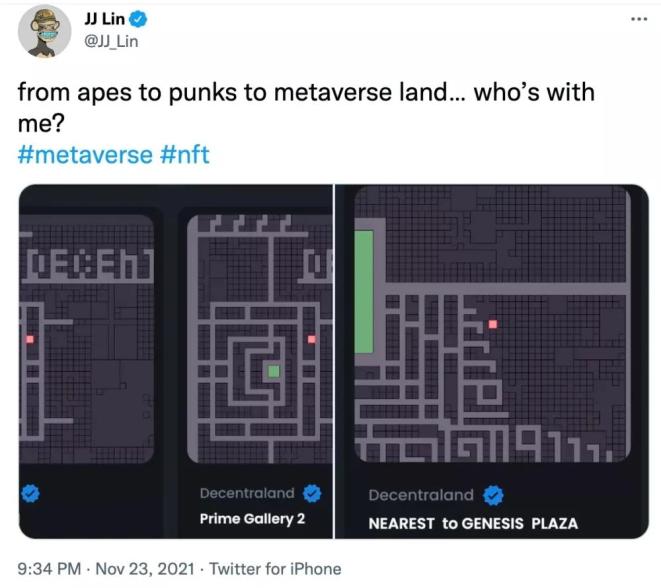 歌手林俊杰在推特上宣布已在元宇宙里购买了虚拟土地