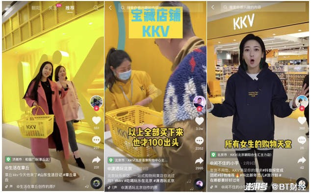 KKV商店大多开在一二线城市的大型繁华商业体里,明黄色的品牌色非常亮眼,辨识度很高,有自媒体探店感慨道“小姐姐们来到这里,拉都拉不住(忍不住要购买)”。