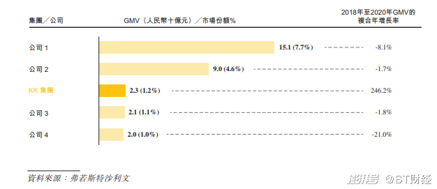 此次冲击IPO,KK集团意在成为港股“潮流零售第一股”。公司招股书援引弗若斯特沙利文数据显示,按GMV计,KK集团不仅是2020年中国三大潮流零售商之一,而且是前十大市场参与者中增长最快的一家,2018年至2020年的GMV符合年增长率高达246.2%。分拆来看,四家店铺各具千秋,KKV及KK馆共同位列中国潮流零售市场精品集合类第四名,THE COLORIST是中国潮流零售市场美妆类的第三名。但BT财经发现,所谓“三大潮流商”之一,KK集团和前两名的市场份额差距巨大。