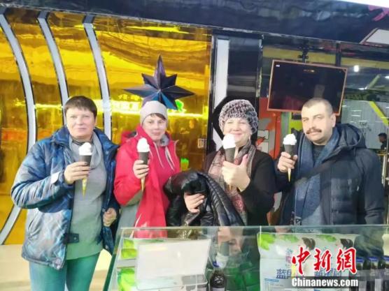 图为俄罗斯游客品尝黑河瓦利亚大豆冰淇淋。