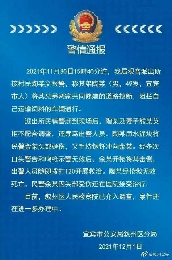 近日,“村民袭警并无视鸣枪示警,被枪击倒地身亡”一事件引发网友关注。据了解,四川省宜宾市公安局叙州区分局官方微博@叙州警方12月1日通报称,民警处警过程中,一男子袭警,经多次口头警告和鸣枪示警无效后,民警开枪将其击倒,该男子经抢救无效死亡。目前,检察机关已介入调查。