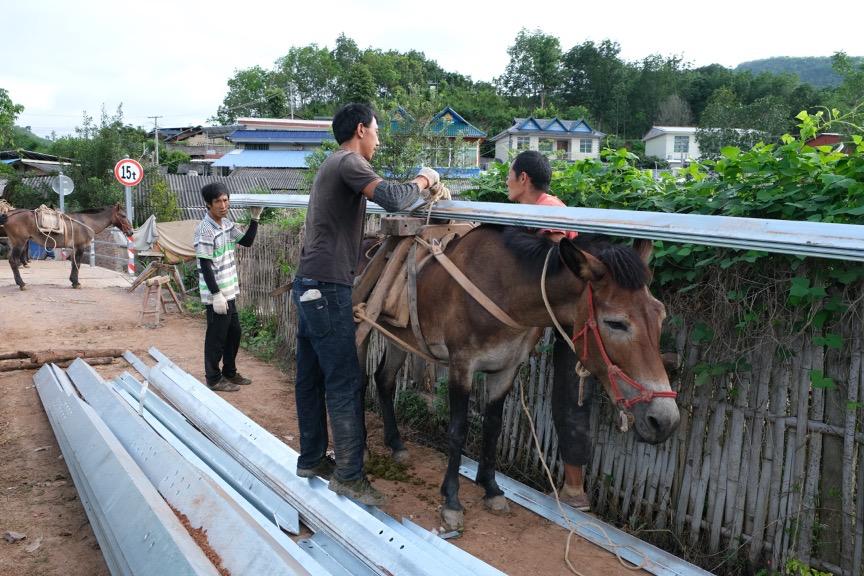 为了保护当地生态环境,许多山林地区尽量不修建专门的施工便道,这也意味着塔材需要采取原始的肩挑马驮来运输。图为中老铁路云南西双版纳段施工现场用马帮运送塔材。(周志旺 摄)