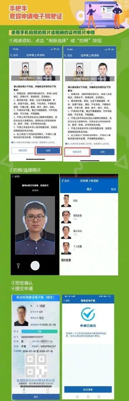 对信息系统无符合要求留存照片的,申请人可通过拍照方式提交电子照片,申领电子驾驶证。提交照片后,公安机关交通管理部门将在1个工作日内进行审核,对符合要求的,“交管12123”APP将生成电子驾驶证,并推送申请成功信息。需要提示的是,请认真阅读照片拍摄须知,选择白色背景,着深色衣服,请他人帮忙拍摄。