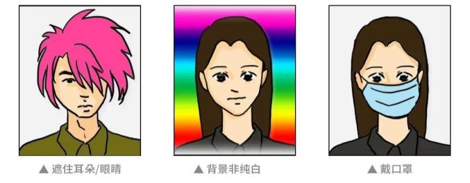 2、着深色衣服、免冠,头发不遮盖面部、耳朵,发型不凌乱、蓬松,不化浓妆,不着制式服装,不戴口罩、墨镜、帽子、围巾、饰品,佩戴眼镜拍照时眼镜片不能有反光看不清眼睛的情况。