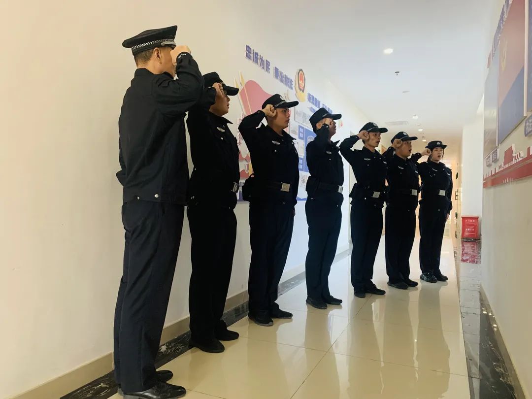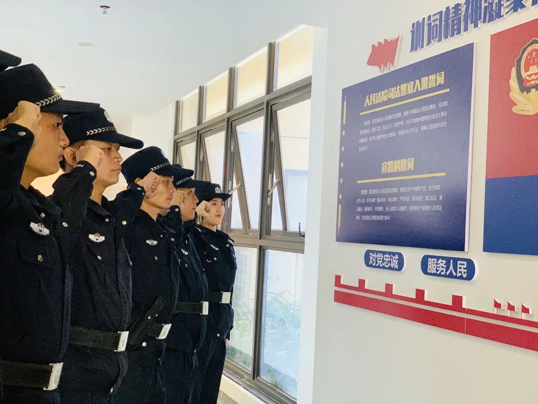 在庄严雄伟的国歌声中,仪式正式开始,支队领导向6位新同志颁授警衔、警号,随后在支队长的带领下,新同志面向警旗,庄严宣誓。在这一刻,6位新同志正式成为了一名光荣的人民法院聘用制司法警察。