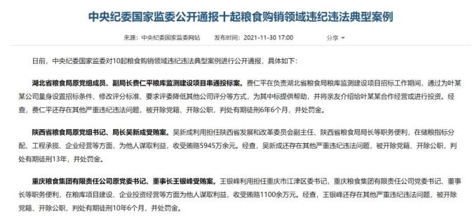 中央纪委国家监委网站 陆丽环报道 11月30日,中央纪委国家监委公开通报10起粮食购销领域违纪违法典型案例,充分彰显了党中央坚定不移推进党风廉政建设和反腐败斗争的坚强决心和坚定意志,释放了“莫伸手、伸手必被捉”的强烈信号。