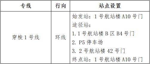 穿梭巴士共有两条摆渡线路,分别为“1号、2号航站楼摆渡专线”和“1号航站楼停车场间摆渡专线”,并且24小时不间断运行。
